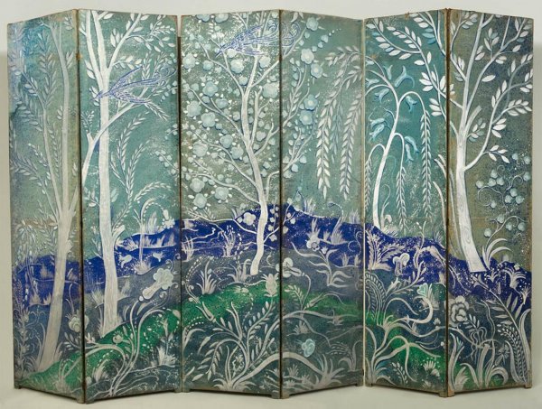 Chanler’s screens occupy an unusual aesthetic space. They are neither mural nor canvassed art. Instead, they invoke a fin de siècle fascination with Asian formats