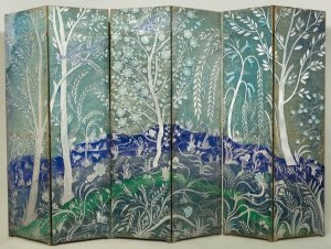 and styles: among them, the screen. Chanler seizes and exploits the medium. Said to be an homage to a ferocious ex-wife, Chanler’s Leopard and the Deer rolls on casters in a black, ebonized frame around and across the reception room to Rokeby House, as though stalking its inhabitants. The principal leopard rises and curls over and down upon the frozen struggle of a white stag. It’s knees bent, with one fore-leg struggling to stand, the stag looks skyward and accepts the leopard’s toothsome embrace over neck, chest and back. Meanwhile, the leap of leopards rollick up a hill in pursuit of still more prey among the narrow cover of a sparsely placed forest. It’s a scene that rises and falls with the search and capture of desperate and vulnerable prey. It’s a scene that feels like might animate the screen itself and send it around the room in pursuit of the odd and unfortunate visitor.